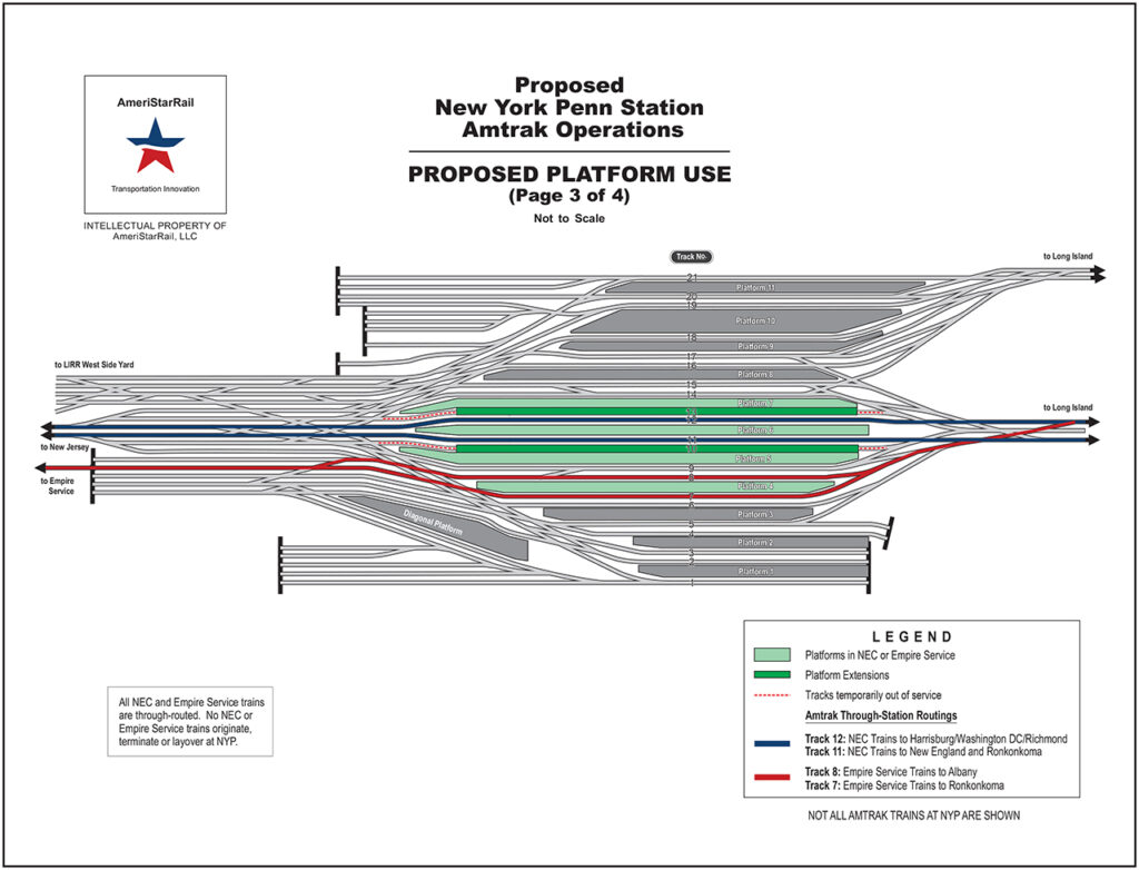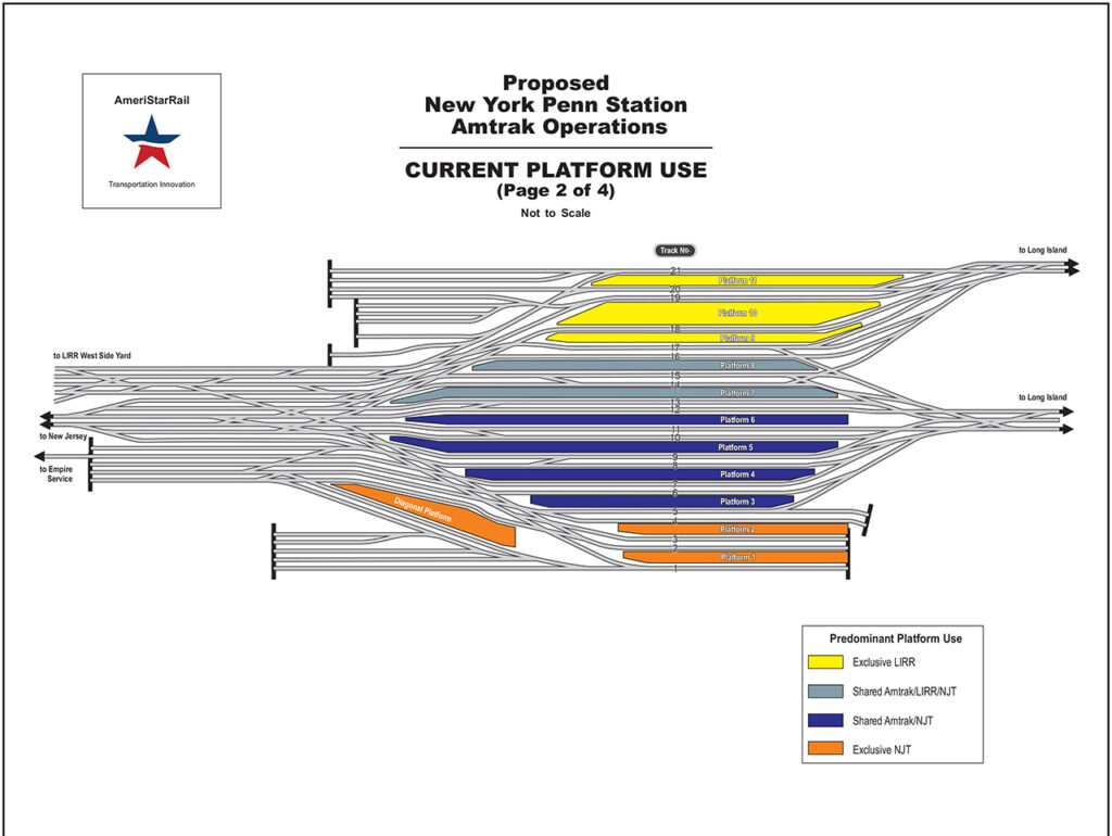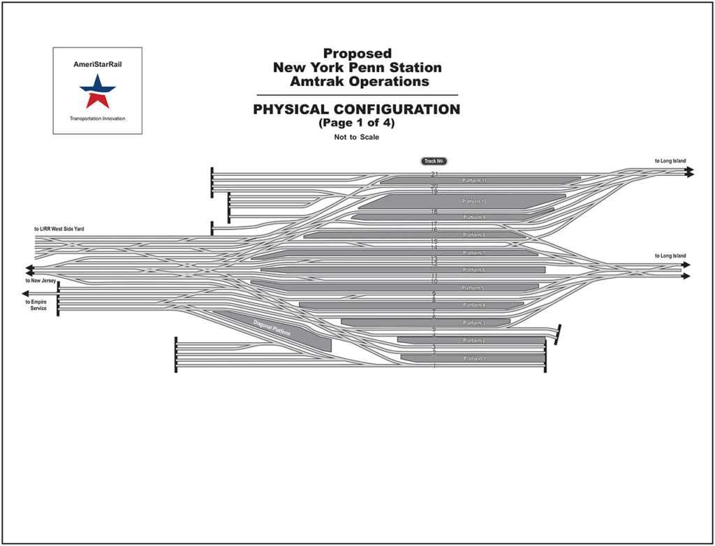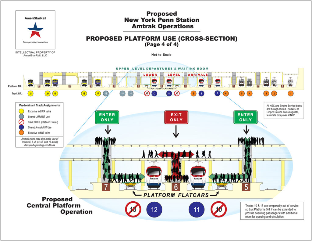 Scott R. Spencer, AmeriStarRail’s Operations Director, told Railway Age about the company’s plan. It “is to turn Penn Station into a truly through-running station” by eliminating stub-end operation as much as possible. He proposes using platform cars to remove tracks that are not needed for the through operation, which would create wider platforms for easier and less-crowded boarding and alighting.