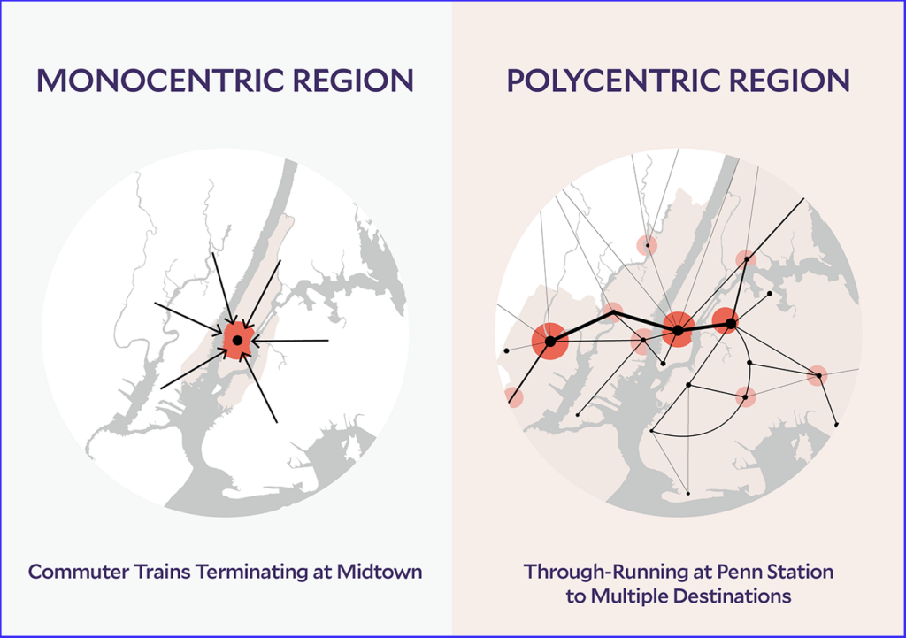 In 2017, ReThinkNYC published a monograph that contained the organization’s detailed proposal for a new type of railroad that would serve four regional centers, the ReThink Trunk Line. Penn Station would be one of those centers, as would the existing Secaucus Junction Station on NJ Transit, where the Amtrak-owned Northeast Corridor (NEC) and historic Erie Railroad and Lackawanna Railroad Boonton Line trains that serve Hoboken cross at different levels allowing transfers between them. Another would be Sunnyside in Queens, near Sunnyside Yard, where Amtrak and NJ Transit store their trains that terminate and originate at Penn Station. After leaving Penn Station and Sunnyside, trains would run on the Hell Gate Bridge line. The other would be at Port Morris, in the Bronx. From there, new tracks would connect with Metro-North’s Hudson Line at one place and with the Harlem and New Haven Lines at another. ReThink’s plan is technical and comprehensive, and we can present only a few highlights. There are detailed descriptions of those stations at www.rethinknyc.org, under “hubs” on the website.