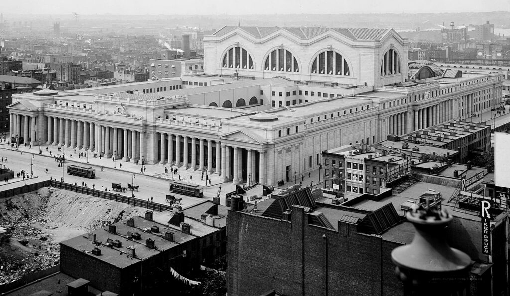 The original Pennsylvania Station New York opened for service in 1910 and lasted a mere 53 years. It was a magnificent edifice, reminiscent of the grandeur of the greatest structures of Ancient Greece and Rome. A few bannisters on the stairways down to the platforms remain from the old building, but essentially everything else fell to the wrecking ball to be replaced by the third incarnation of Madison Square Garden, roughly one mile from its original and namesake location. The tracks and platforms are still there, although the great station has been transformed into a subterranean maze where most riders who alight from the trains move quickly toward the street above or the Seventh and Eighth Avenue subways. I visited it once, when I was about ten and my mother and I went to see my father off on a business trip. I can’t say I remember any detail about the old station, but it was huge, impressive and magnificent.