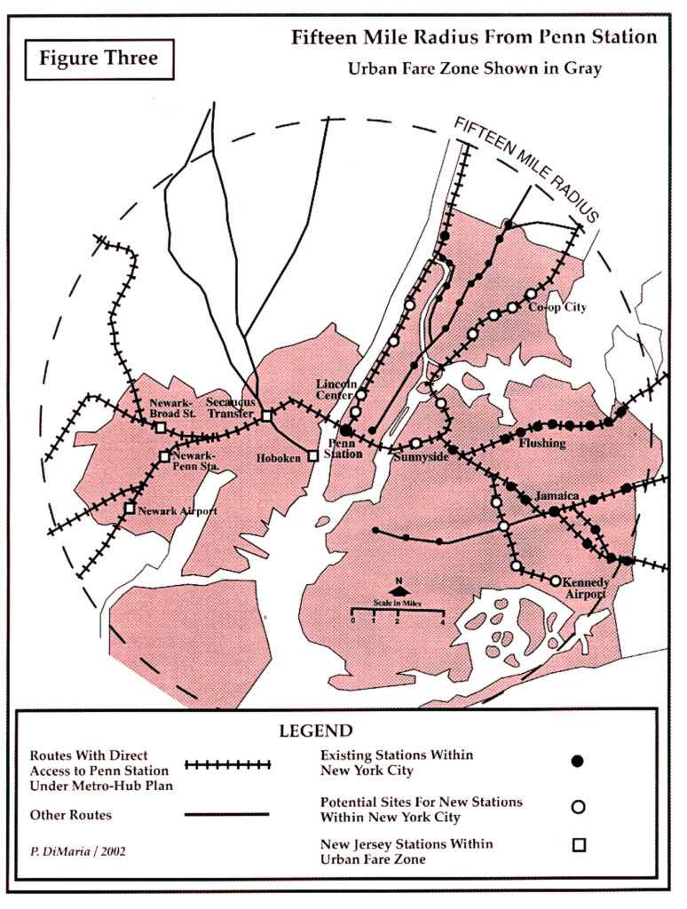 The plan called for frequent service, at least every 20 minutes outside peak commuting periods. It also called for regional-level fare integration, including among railroads and transit in New York City. The plan document claimed that “Gains in ridership and operating efficiency make the plan affordable” and that “riders from all three states benefit.” One of those benefits would be an ability to use the railroad within the City’s limits to gain additional connectivity, rather than having to use slower city transit. The stated goal: “With full support from elected officials, the regional transit agencies can take full advantage of Penn Station’s unique design and convert the commuter rail lines into an efficient regional rail system, to equal or surpass successful examples in London, Paris and Berlin.”
