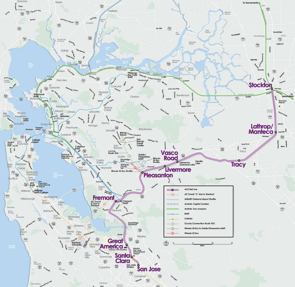 Valley Pacific Petroleum Services, Inc. is supplying the 51,000 gallons of fuel per month needed for the ACE locomotives. The renewable diesel is made from “responsible and sustainable feedstock, such as used cooking oil and/or inedible corn oil,” according to San Joaquin Regional Rail Commission, the designated owner, operator and policy-making body for ACE, which comprises an 86-mile corridor between Stockton and San Jose with 10 stations (see map below).