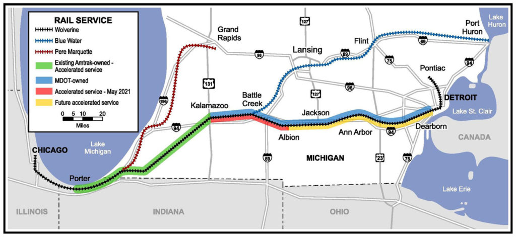 Also, Amtrak will begin suspending its Wolverine Trains 350 and 353 Monday through Thursdays starting July 31, according to an MLive.com report. Amtrak and the Michigan Department of Transportation will be making infrastructure improvements through the first week of October, the news outlet said. The trains operate along the 304-mile Detroit/Pontiac-Chicago corridor (see map above). During the service suspension, they will only run Fridays, Saturdays and Sundays, but “Blue Water Trains 364 and 365 will operate normally and also serve Wolverine stations in southwestern Michigan,” MLive.com reported. “Trains 351, 352, 354 and 355 will operate normally.”