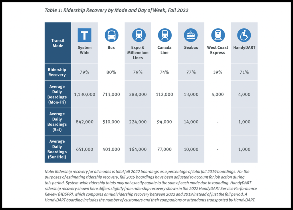 “[S]ystem-wide ridership recovery in fall of 2022 reached 80% of pre-COVID-19 pandemic levels from fall 2019,” according to the agency’s 2022 Transit Service Performance Review (see above). “We moved upward of 380,000 people per weekday in fall 2022 and some parts of our region—including the fast-growing Southeast and Pitt Meadows/Maple Ridge sub-regions—began to see ridership rates that exceeded those that were experienced before the onset of COVID-19.”