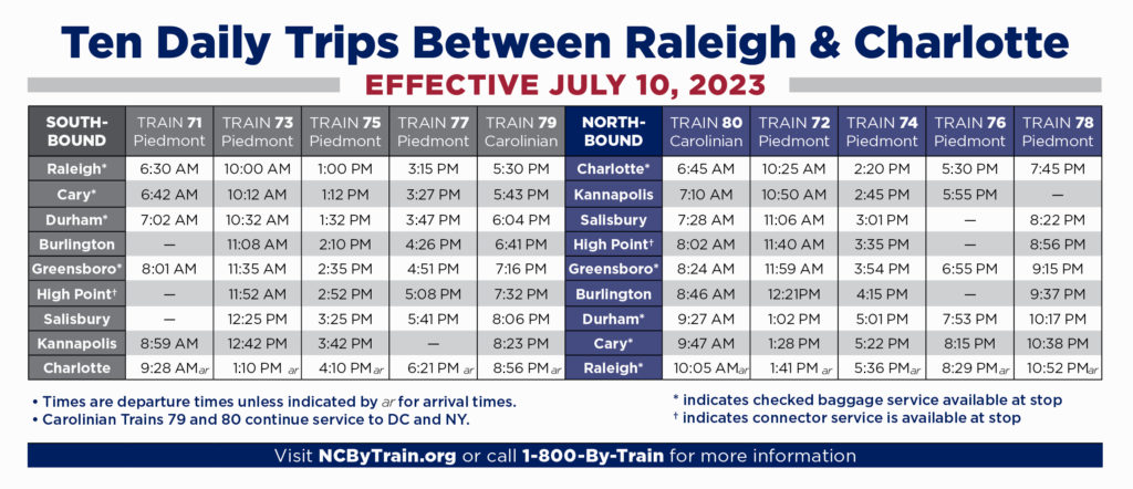 To meet the growing demand for train service, Amtrak and NC By Train announced July 10 that the North Carolina Department of Transportation (NCDOT) sponsored Piedmont and Carolinian, which travels daily from New York to Charlotte, will now offer five daily roundtrips for travel between Raleigh, Charlotte, and points in between.