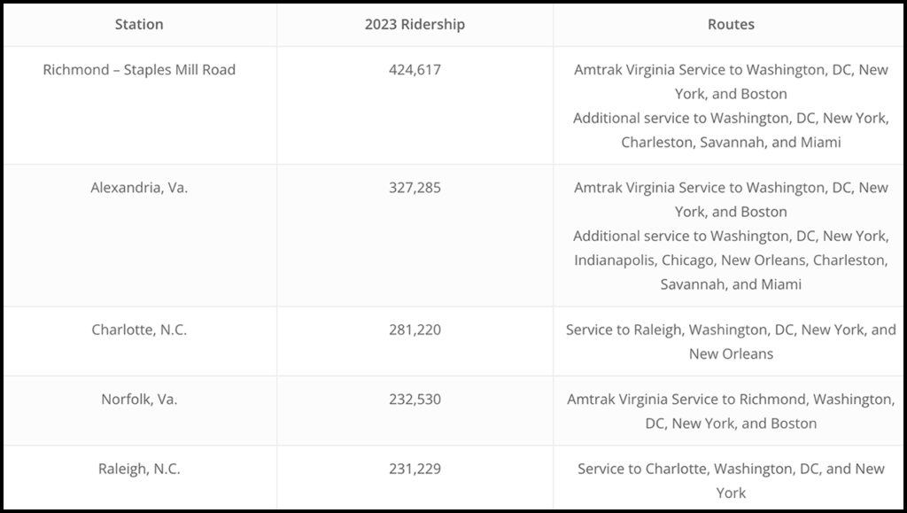 “Richmond is not just the capital of Virginia, it’s the epicenter of the East, connecting the Southeast and the Northeast by rail,” said DJ Stadtler, Executive Director of VPRA, which oversees the commonwealth’s Amtrak Virginia service. “All three of these stations—Richmond-Staples Mill, Alexandria, and Norfolk—[on the list of Amtrak’s top five in the Southeast] offer Virginians access to rail service connecting the commonwealth with the rest of the East Coast.”