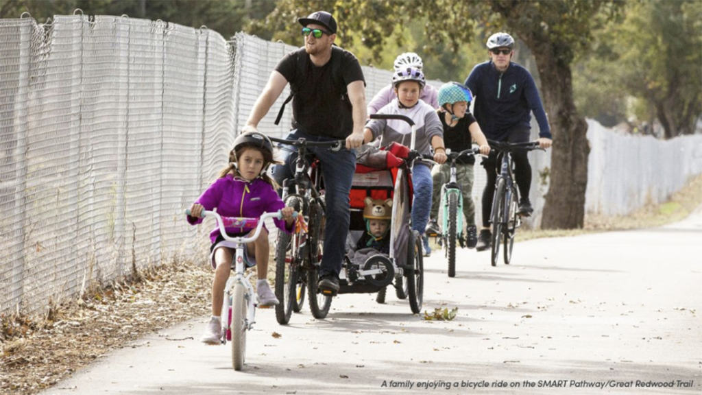 The SMART Pathway is the southern portion of the Great Redwood Trail, which provides first- and last-mile connections to SMART commuter rail stations and offers a safe way to travel along the rail corridor, particularly in areas where the SMART Pathway is the shortest path of travel between communities, according to the railroad, whose 45-mile system includes stations in the Sonoma County Airport area, Santa Rosa, Rohnert Park, Cotati, Petaluma, Novato, San Rafael, and Larkspur.