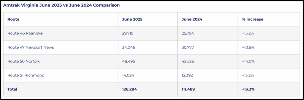 The month of June 2025 also set a record with 126,284 riders, according to VPRA. This was the highest ridership the commonwealth has seen in June since the Amtrak Virginia service launched. All four corridors logged double-digit increases in June.