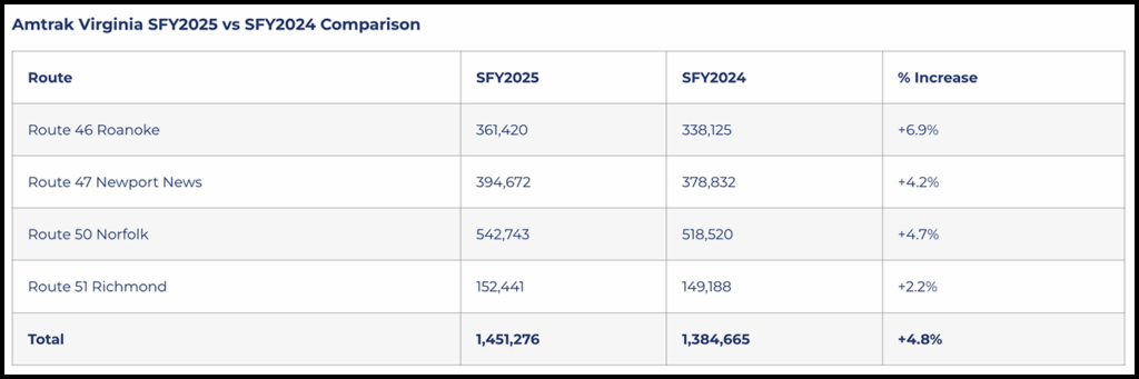 Amtrak Virginia set a ridership record for State Fiscal Year (SFY) 2025, beginning July 1, 2024, and ending June 30, according to the Virginia Passenger Rail Authority (VPRA), which manages all administrative and fiduciary responsibilities for Amtrak Virginia, including the current eight daily roundtrips originating in Roanoke, Norfolk, Newport News, and Richmond, and which provides funding to Virginia Railway Express commuter rail.