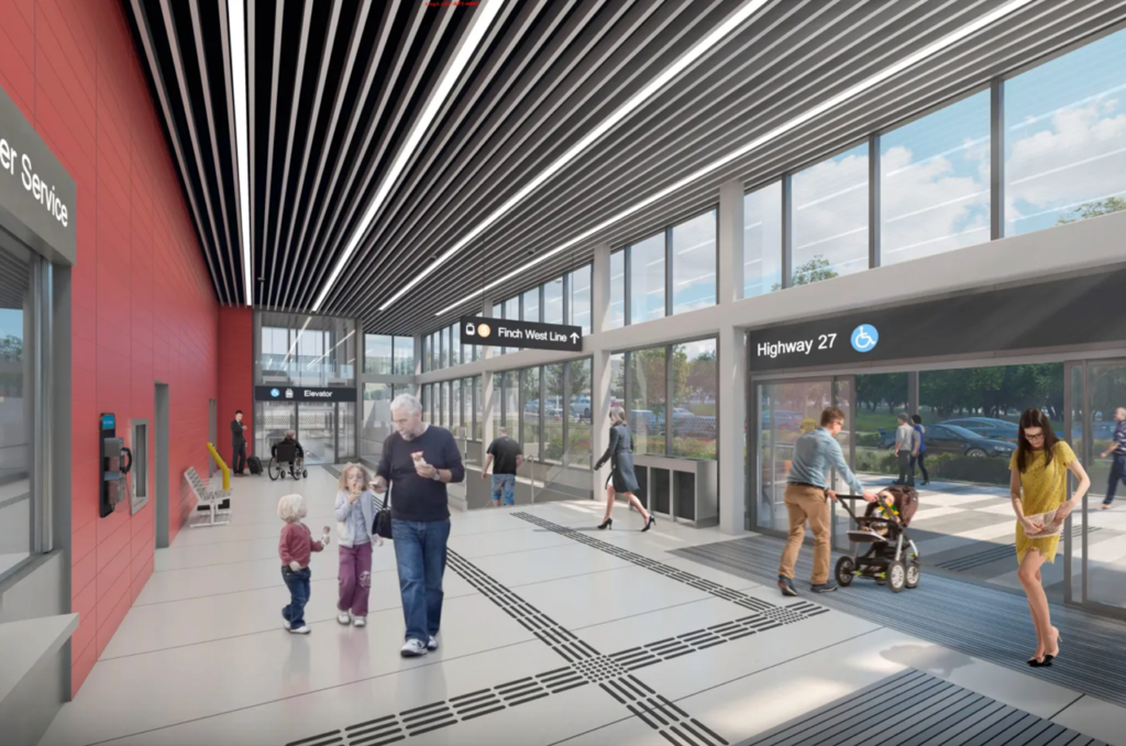 On Finch West LRT, both terminal underground stations and surface stops will employ glass instead of the more traditional non-transparent material options. The structures and stops on the outside of the station—as well as interior features like railings, elevators and elevator shafts—will be made almost entirely of glass, according to Metrolinx.