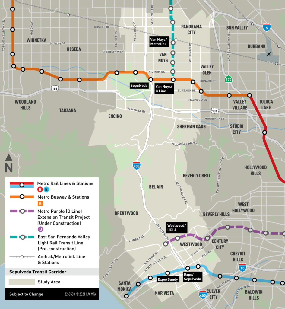 LACMTA is working with two private-sector teams, LA SkyRail Express (including John Laing, BYD, Skanska, ACI, HDR, Gensler and Innova) and Sepulveda Transit Corridor Partners (including Bechtel Development Company, Meridiam Sepulveda and American Triple I, Bechtel Infrastructure, Mott Macdonald, T.Y. Lin, and Systra) for pre-development work on the Sepulveda Transit Corridor Project that will connect Los Angeles’s San Fernando Valley with the Westside (see map above).