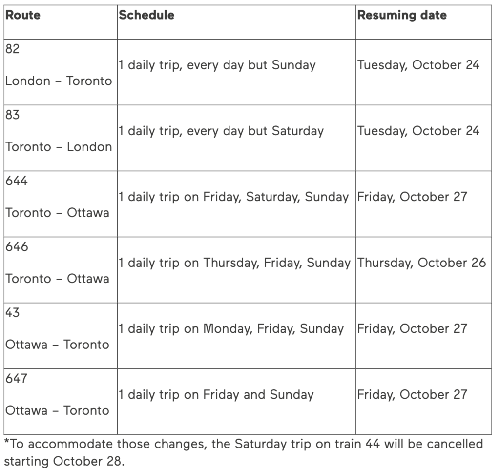 VIA Rail on Sept. 7 announced the reintroduction of two trips between Toronto and Ottawa and one round trip between London and Toronto, starting this October.