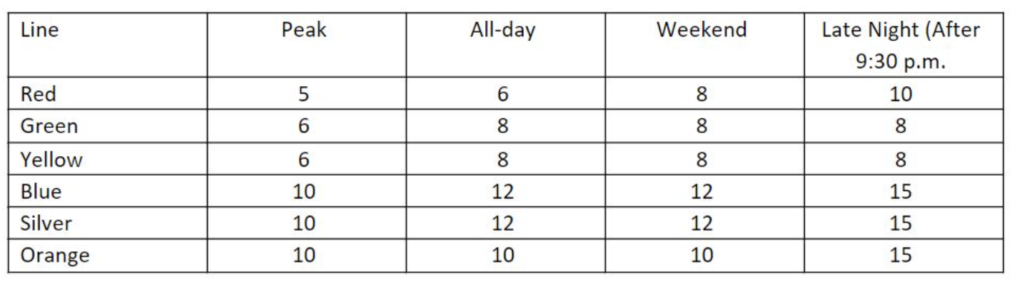 With ridership trending higher during the morning and evening commuting hours, WMATA will boost peak service on the Red, Blue, Silver, Green, and Yellow lines to meet demand and ridership growth as more customers return to the office and other activities. Trains on those lines will run more frequently from approximately 7 a.m. – 9 a.m., and from approximately 4 p.m. – 6 p.m. Exact times of peak service will vary by station.