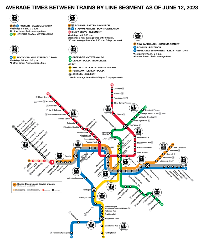 By the end of the month, WMATA says it will have implemented 10 service improvements since last summer to meet rising demand for transit and deliver frequent transit service for the region. “With the June 26 service improvements, we’ll have 58% more trains in service on weekdays compared to last July, and a 73% increase in train trips,” the agency said.