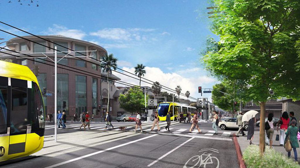 LACMTA’s 6.7-mile East San Fernando Valley Transit Corridor light rail line (rendering above) would add a north-south connection between Pacoima and Van Nuys.