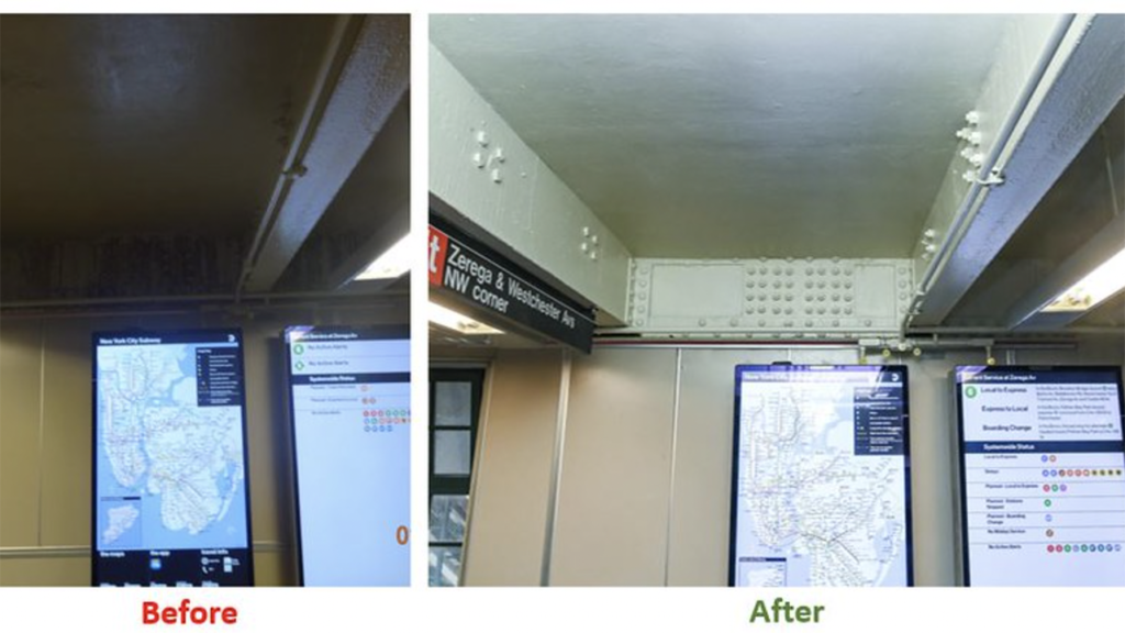 “Over the last weekend, while planned track work and Americans with Disabilities Act (ADA) upgrades took place, transit workers installed new LED fixtures to brighten darkened areas, repaired concrete tripping hazards, cleaned service and emergency lighting, remediated water damage, and scrubbed and repainted station surfaces,” MTA reported. “The station uplift also includes refurbishment of transit employee facilities within the station as customers will now be able to enjoy a cleaner, brighter and revitalized Zerega Avenue station.”