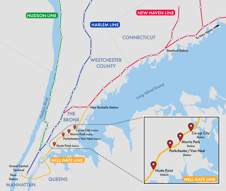 Also included in the project are four new stations in the East Bronx—at Hunts Point, Parkchester, Morris Park and Co-Op City—which would be part of the New Haven Line. At Penn Station, riders from Connecticut, Westchester and the Bronx would be able to connect with MTA Long Island Rail Road, New Jersey Transit, Amtrak, Port Authority Trans-Hudson Corp. (PATH), and MTA New York City Transit subway and bus services. According to MTA, the commute from Co-op City to Penn Station would be reduced from 75 to 25 minutes, and the commute from Hunts Point to Penn Station would be cut from 45 to 16 minutes.