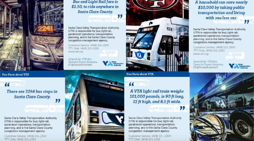 Selected SCVTA train and bus operators are now handing out limited-edition trading cards to riders, the transit agency reported Jan. 30. The free cards feature light rail and bus photographs by SCVTA bus operator Danny Quintana as well as public transit facts and information about SCVTA. The agency is producing 10 different cards. Copies of the first two are being distributed this week and include images of a VTA light rail train in front of Levi’s Stadium and a VTA bus in a crystal ball; copies of two new cards will be distributed each month thereafter.