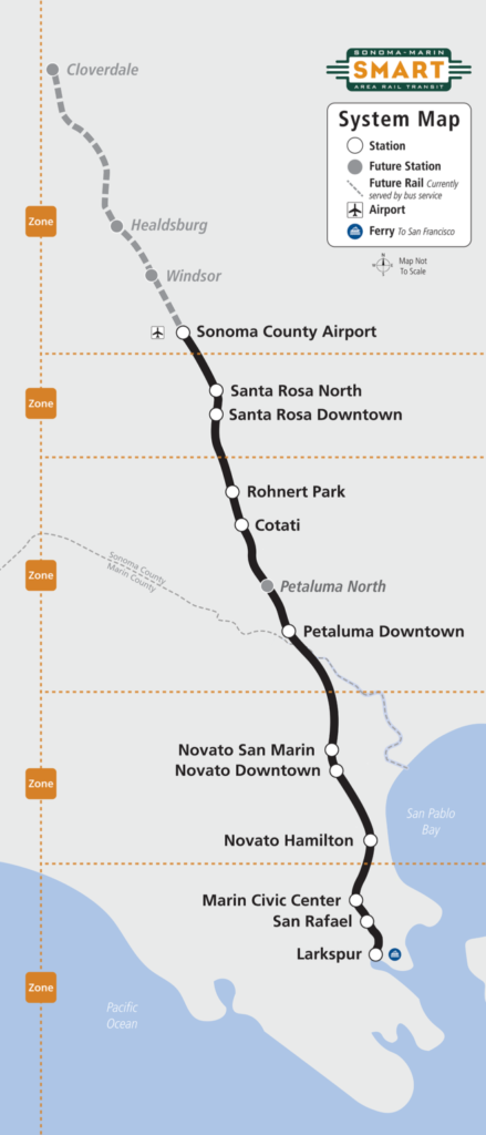 SMART’s 45-mile commuter rail system in northern California includes stations in the Sonoma County Airport area, Santa Rosa, Rohnert Park, Cotati, Petaluma, Novato, San Rafael and Larkspur (see map, left). Service expansion to Windsor, Healdsburg and Cloverdale is planned.