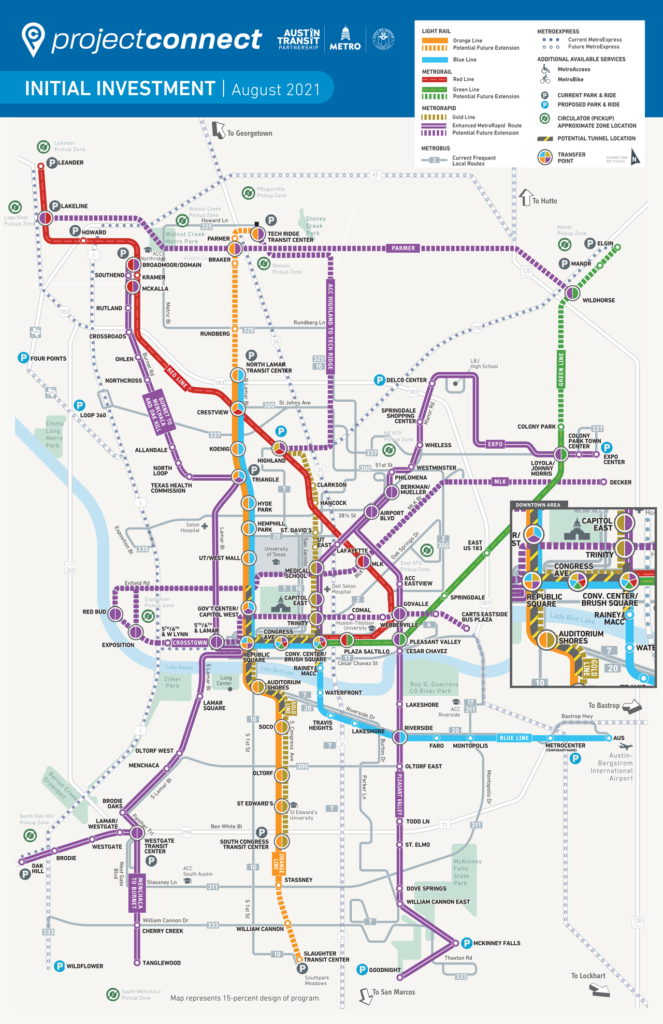 On the rail side, Project Connect includes three new light rail lines (21-mile Orange, 15-mile Blue and 9.5-mile Gold); two additional commuter rail stations along the MetroRail Red Line, which extends from downtown Austin to Leander; a new 27-mile MetroRail Green Line, which would connect neighborhoods east of central Austin to downtown; and a new light rail tunnel in the downtown area.