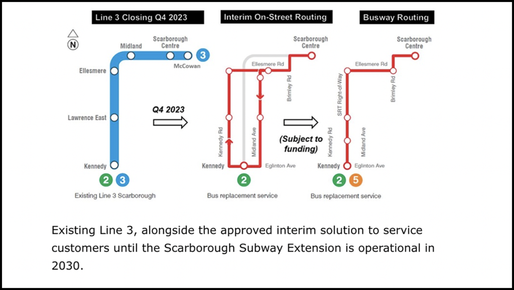 Service on Line 3 was suspended following the derailment south of Ellesmere Station and replaced with frequent shuttle bus service. “A comprehensive review, that includes the participation of industry-leading consultants, is still under way,” according to TTC. “However, given the time required to complete the review, the decision has been made to permanently close the line and begin to implement elements of the replacement plan. These measures will improve transit priority and operations, provide frequent, high-capacity bus service and ensure customers can plan their trips online in September.”