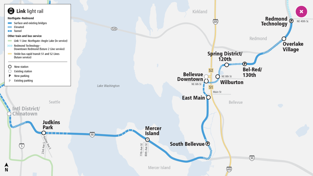 Fourteen miles long, the complete East Link light rail extension includes 10 stations from Seattle’s International District to Judkins Park, across I-90 to Mercer Island and South Bellevue, and through downtown Bellevue and the Bel-Red area to Redmond Technology Station. An initial eight-station segment between South Bellevue and Redmond Technology will open in spring 2024.