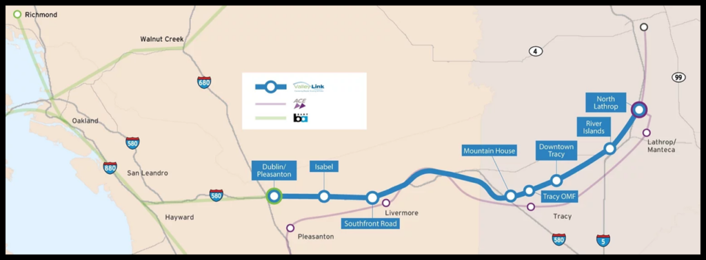 When complete, the full 42-mile, seven-station project will run from the Dublin/Pleasanton BART station to the North Lathrop Altamont Corridor Express (ACE) station. With 33,000 daily riders projected by 2040, Valley Link would remove tens of thousands of cars off Interstates 580 and 205 and connect nearly 500 miles of passenger rail with more than 130 stations in the Northern California Mega-region. It is expected to operate with hydrogen-powered trainsets.