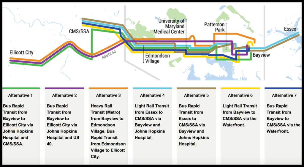 - BRT from Essex to CMS/SSA via Bayview and Johns Hopkins Hospital. This 17.1-mile route would include 33 stations.
