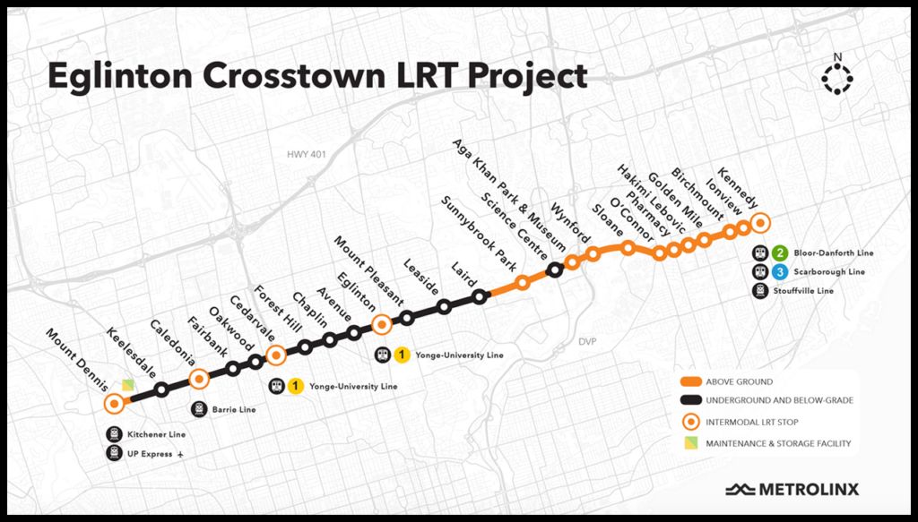 Crews on the 12-mile Eglinton Avenue Crosstown LRT project between east and west Toronto (see map below) are installing and testing Guideway Intrusion Detection Systems (GIDS) and platform warning scanners, according to project-owner Metrolinx. Each of the Crosstown’s 15 underground stations will be equipped with a GIDS that uses laser scanners to sense when people and objects enter the tracks. “If a person is detected on the tracks, an automatic signal is sent to train control system and the train stops without the driver’s assistance,” Metrolinx reports. “At the same time, the PA system triggers an announcement warning the person to clear the tracks, and the associated live CCTV footage will open on the central control room screens.” Ten GIDS scanners will be placed at every station, five on each platform-side tunnel. All five portal entrances will also have GIDS scanners to keep people out of tunnels.