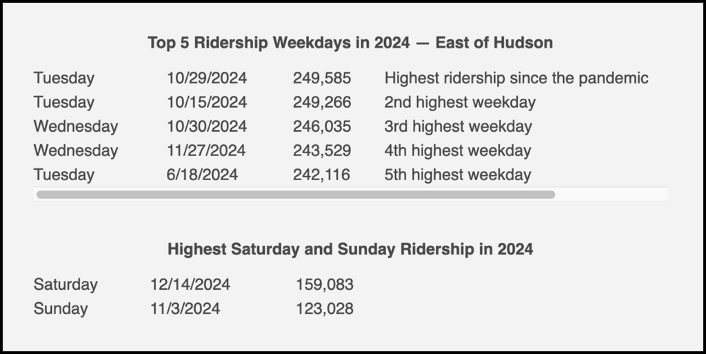 - Ridership continued a “solid” post-COVID recovery, increasing 12.1% from 2023 (60,141,495) to 2024 (67,389,907). October was the most successful ridership month of the post-pandemic era, MTA said, with 6,548,501 riders, up 16.2% from October 2023 (5,637,482).