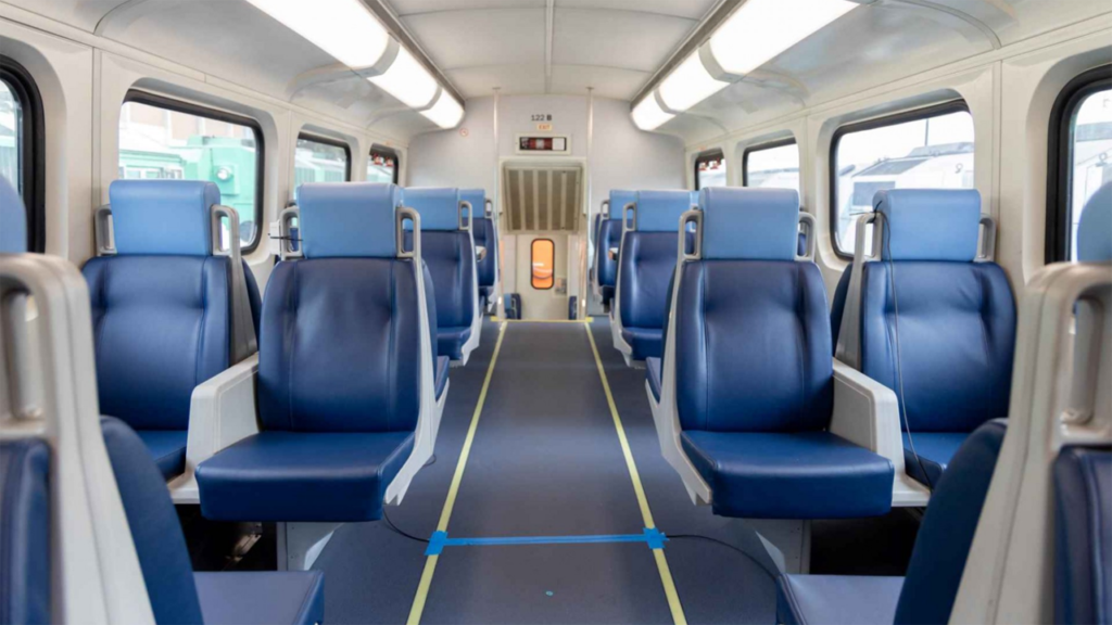 Upgrades include new vinyl seating and non-carpeted flooring, as well as enhanced air filtration and UV lighting for bacteria, air pollutant and virus protection; energy-efficient lighting; new bathrooms; and for safety, side-door obstacle detection, three emergency intercom buttons per car, and emergency fresh-air ventilation in case of power loss.
