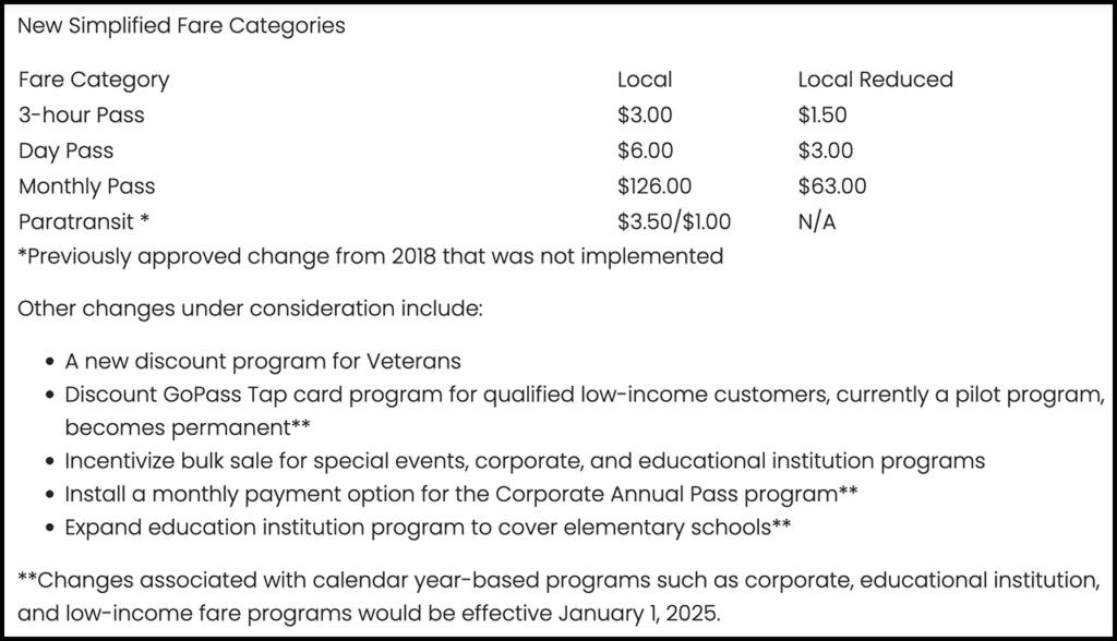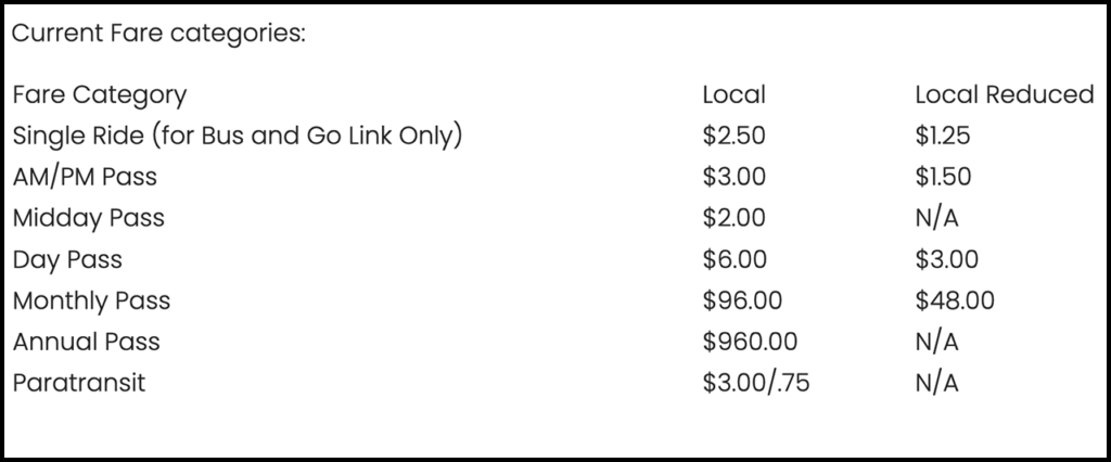 According to DART, staff have performed a comprehensive review and analysis of the current fare policy and structure, “working to understand how any changes might impact ridership and customer experience.” The agency is considering simplifying the fare structure by consolidating the single ride (bus and GoLink only), AM/PM, and midday passes into a standard three-hour pass and eliminating the retail annual pass. The day pass fare will remain the same and the monthly pass will increase.