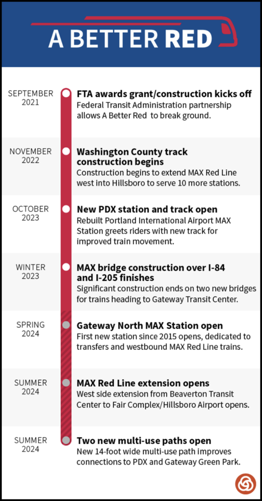 TriMet’s capital projects include the completion this August of A Better Red, which will improve train movement at key sections of the system near Portland International Airport and Gateway Transit Center, and extend the MAX Red Line an additional 10 stations into Hillsboro, helping to provide more capacity in a growing job center of Washington County. TriMet is also replacing its oldest light rail vehicles with new Type 6 models, expanding the SE Park Avenue Park & Ride, and developing its Columbia Operations Facility for testing and expansion of the Zero-Emissions Bus Program.