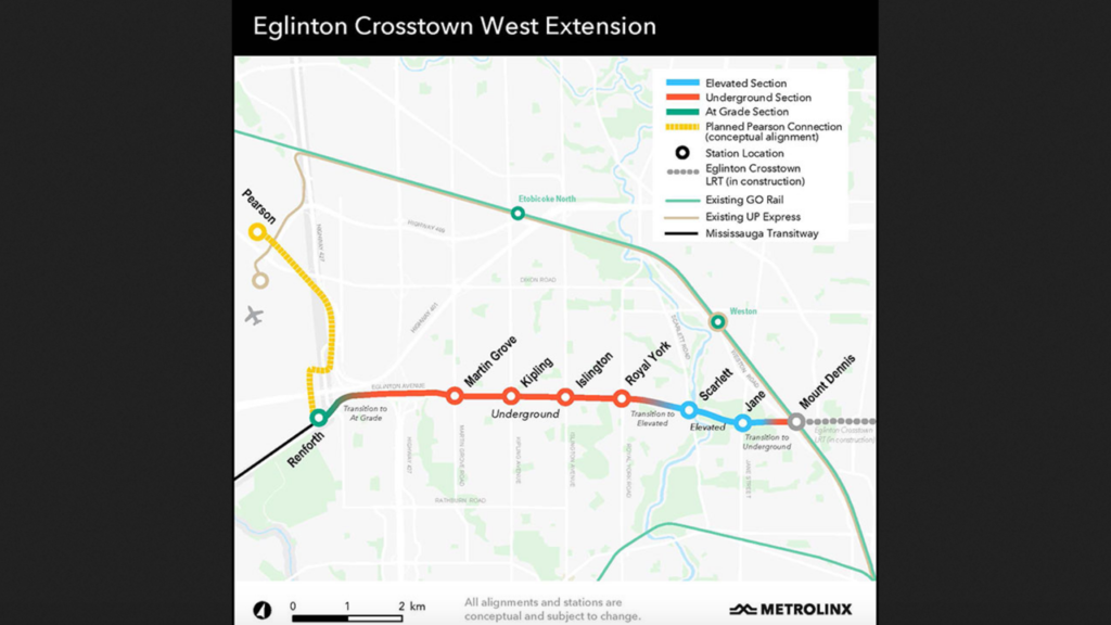 The Eglinton Crosstown West Extension is being delivered via various contracts and will bring the Eglinton Crosstown LRT another five miles (9.2 kilometers) further west, creating a continuous rapid transit line from the east end of Toronto through the heart of the city and into Mississauga. With seven stops, it will operate mainly underground. It is expected to be completed by 2030-31.