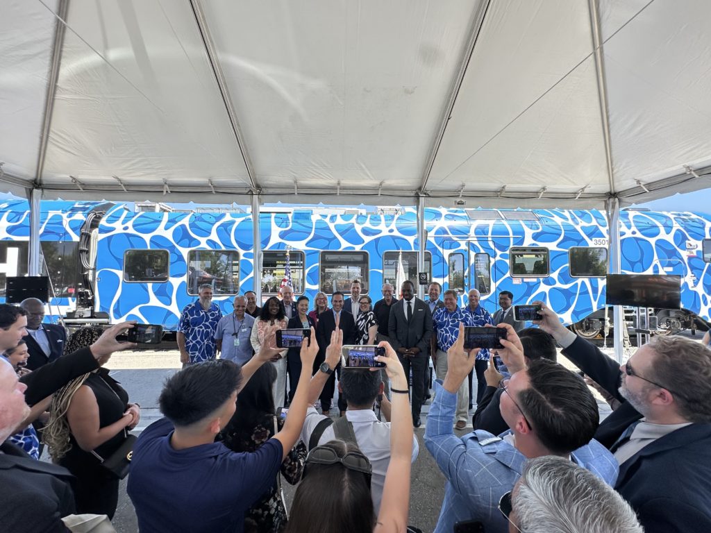 Leaders from the U.S. Congress, California State Transportation Agency (CalSTA), Federal Railroad Administration (FRA), Metrolink and Stadler US convened on Aug. 15 at the San Bernardino Depot train station for a first-hand look at SBCTA’s new ZEMU passenger train.