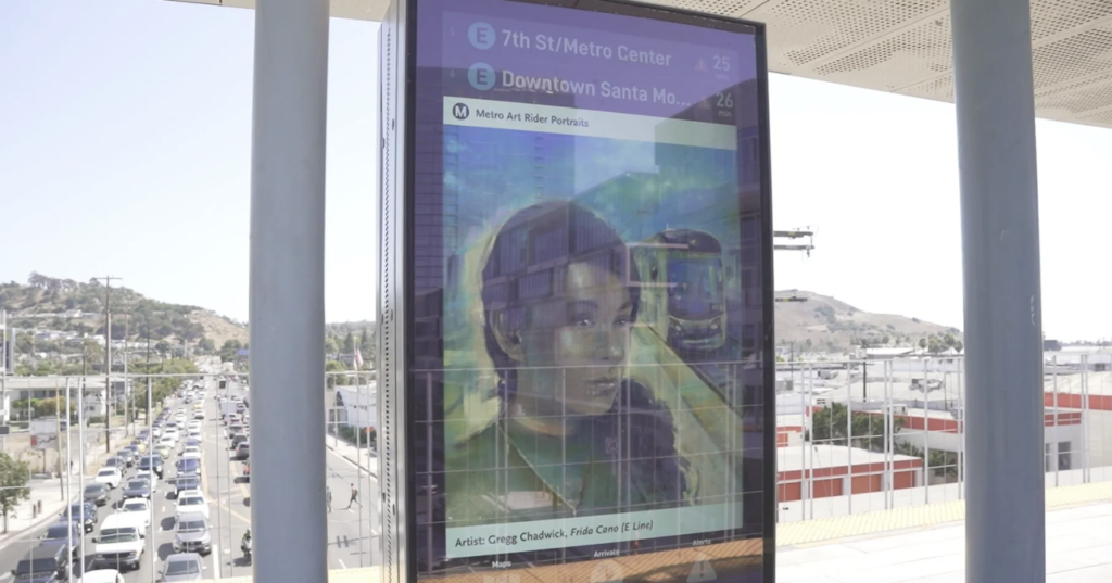 The digital screens, Metro says, are the latest location where riders can view portraits from Metro Art’s multi-site “We Are…” rider portrait exhibition. Community art advisors worked with Metro Art to ensure that the commissioned portraits displayed on the new screens each have a link to the neighborhoods served by E Line (Expo).