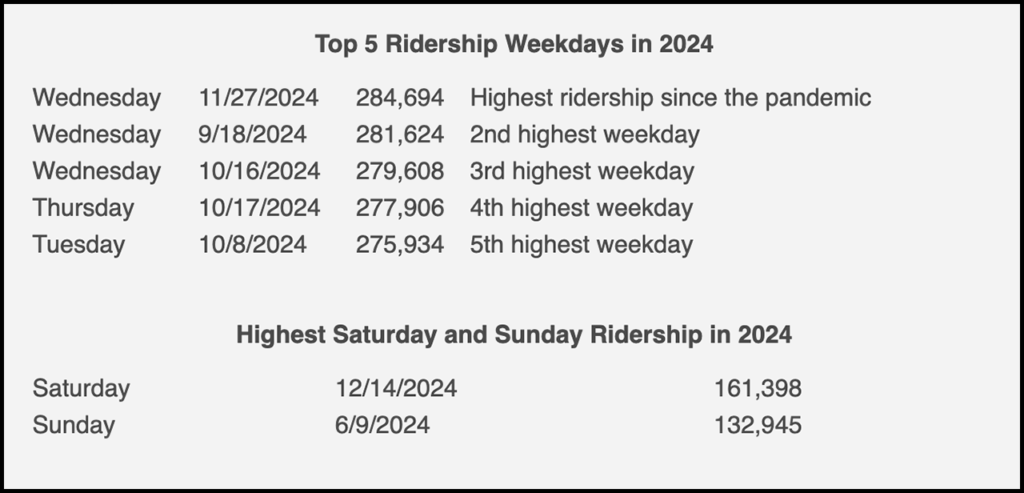 Preliminary ridership statistics for 2024 show an increase in ridership—75.5 million riders rode the LIRR in 2024 compared with the 65.2 million people who rode in 2023, marking a 15.8% increase, according to the Governor’s Office. In November 2024, LIRR not only reached a record on-time performance level of 96.2%—the highest level for that month since the statistic started being kept in 1979—but also carried 6.3 million riders, up from 5.8 million in 2023.