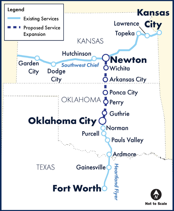 KDOT is evaluating the expansion of intercity passenger rail service in south central Kansas. Its proposed project would connect Amtrak’s Heartland Flyer between Fort Worth, Tex., and Oklahoma City, with an extension north to Wichita and then to Newton, where it would link up with the Southwest Chief (see fact sheet above and map below). The corridor would include new station stops in Edmond, Perry, and Ponca City, Okla., and in Arkansas City, Wichita, and Newton, Kans.