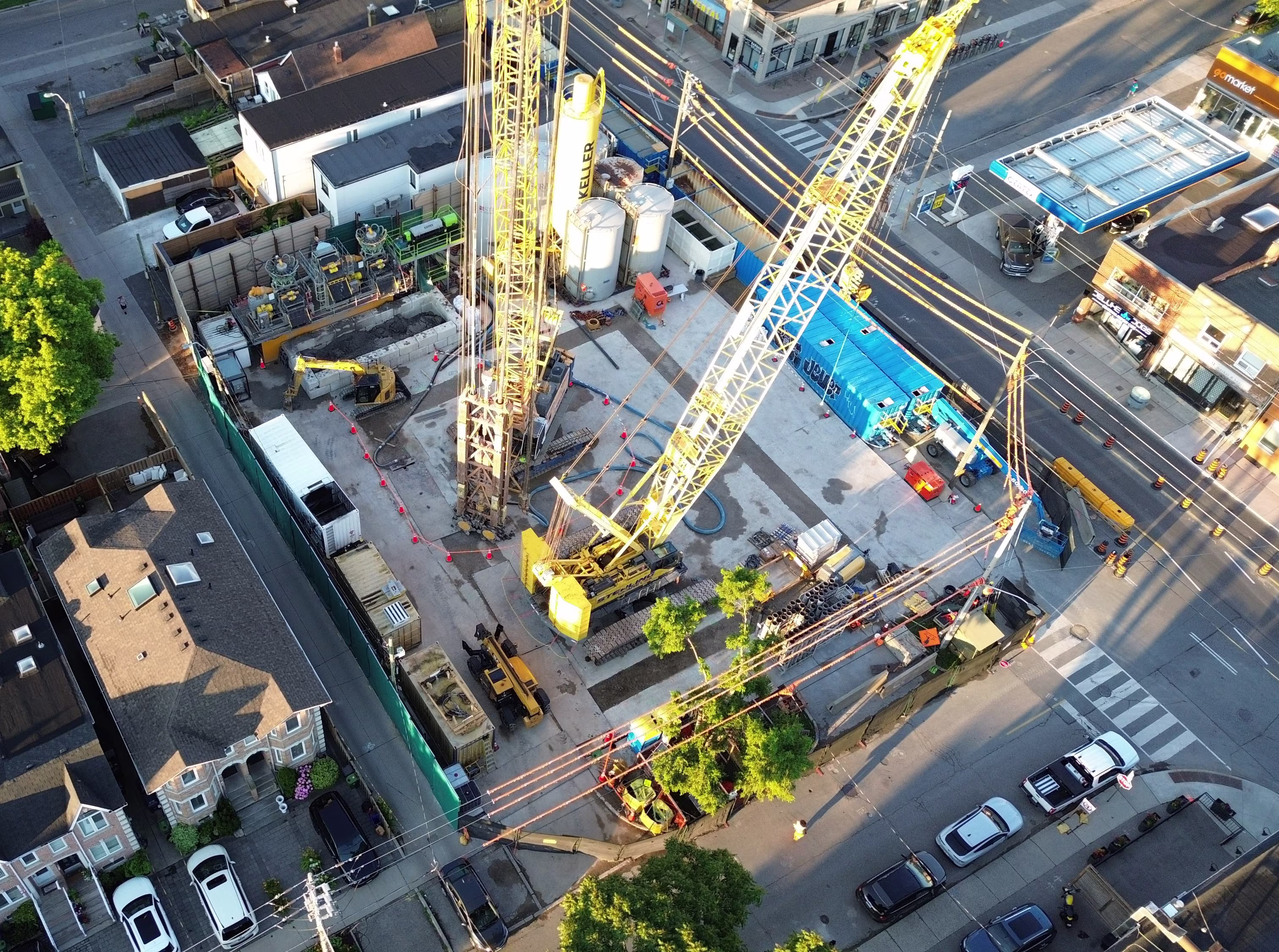 View of an Ontario Line construction site where the same construction method is being used to install foundational supports. (Metrolinx photo)