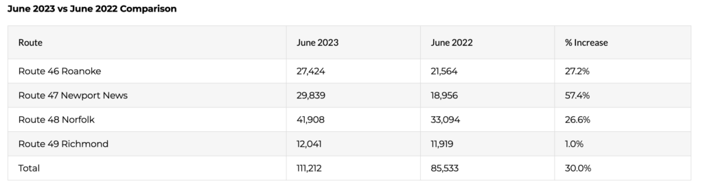 According to VPRA, the month of June also set a record for travel during that month with 111,212 passengers. The previous record for June was set last year when 85,533 passengers traveled. All four Amtrak Virginia corridors saw increases year-over-year from June 2022 to June 2023. Overall ridership was up 30% over last June with the Newport News service seeing the greatest increase of 57.4% from June 2022 to June 2023.