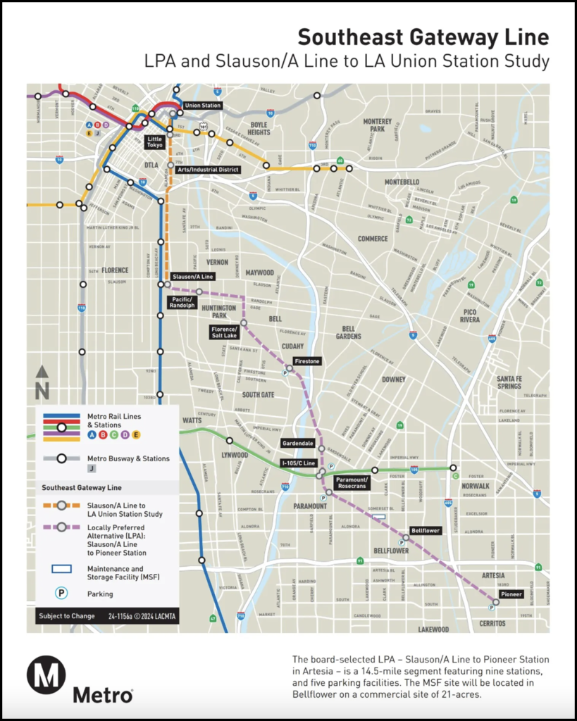 LACMTA and the Federal Transit Administration (FTA) recently released the Final EIS/EIR for the Southeast Gateway Line (formerly known as the West Santa Ana Branch Transit Corridor Project). The transit agency reported that its planned 14.5-mile light rail line (see map below) would span from Slauson/A Line Station in the unincorporated community of Florence-Firestone in Los Angeles to the future Pioneer Station in the city of Artesia (see map below).