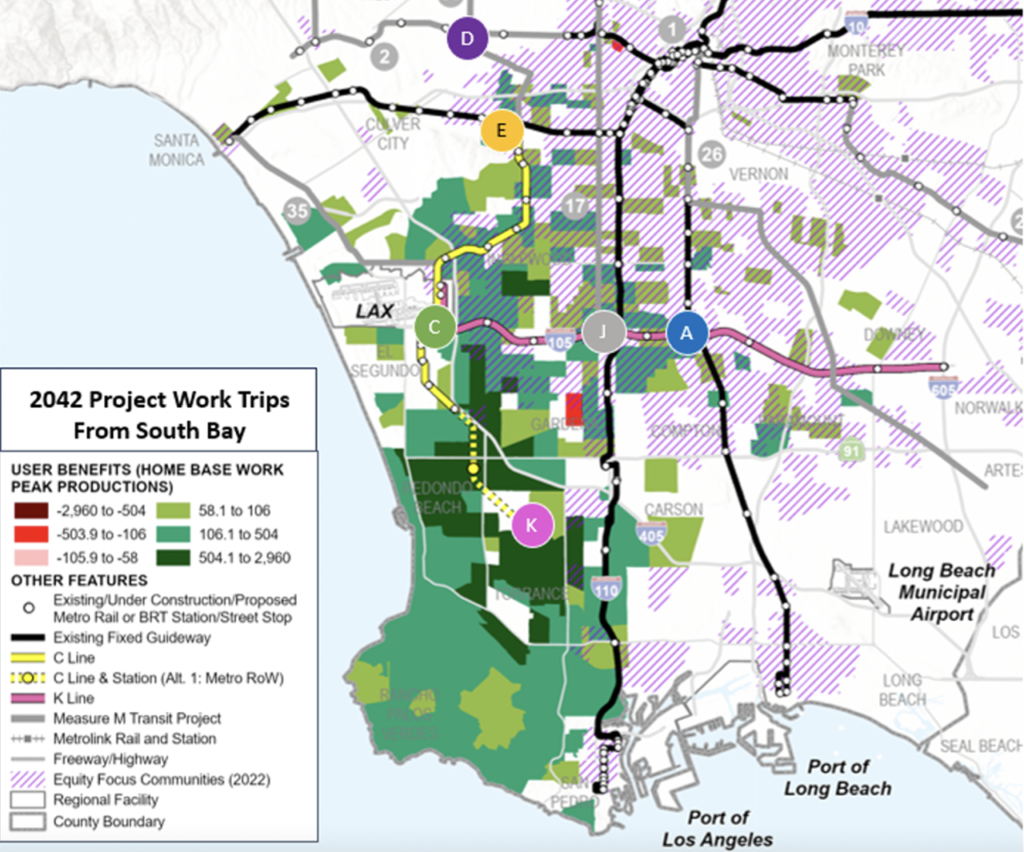As shown in the map below, LACMTA said that its modeling illustrates the project benefits, which extend along the K and C Lines between central Los Angeles, Gateway Cities, and as far south as the Palos Verdes Peninsula.