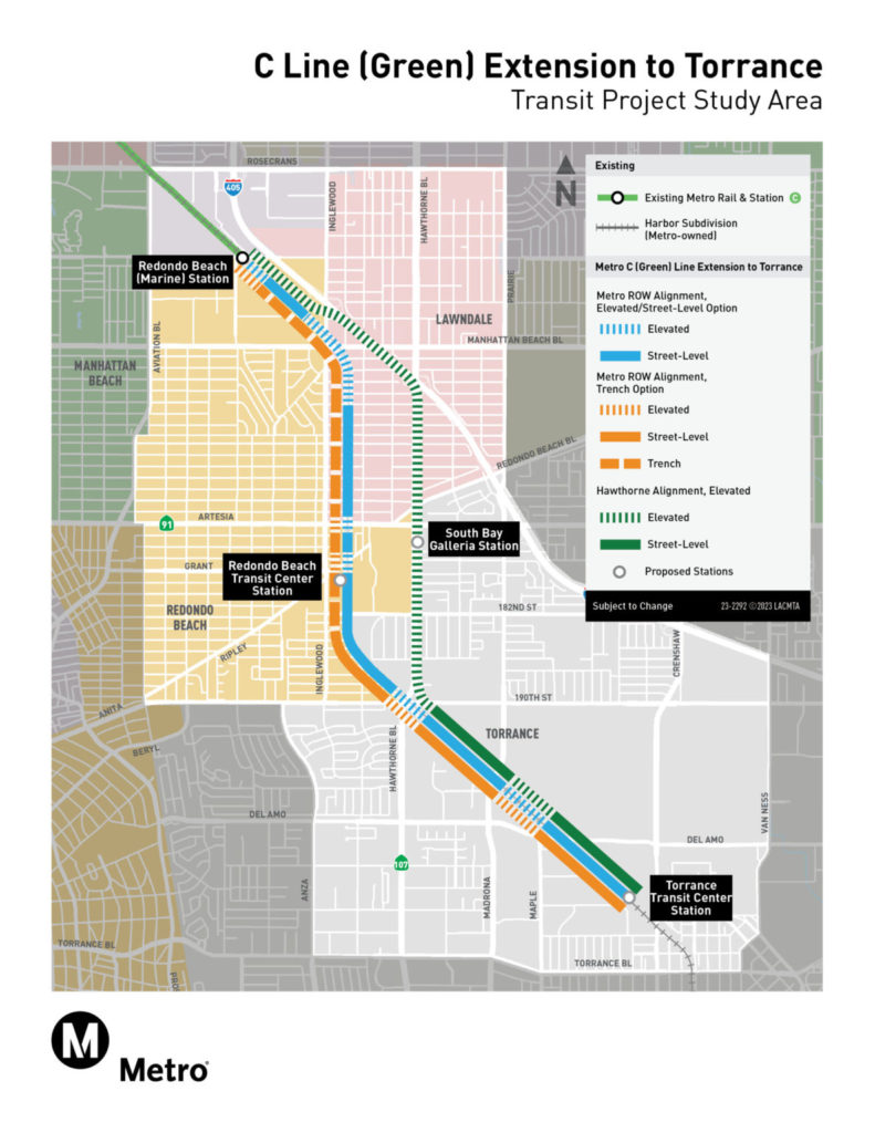 LACMTA plans to expand the C Line from the Redondo Beach (Marine) Station to the new Torrance Transit Center, bringing light rail to the area (see map, left); providing an alternative to congestion along the I-405 corridor; and connecting to the existing K (Crenshaw), J (Silver) and A (Blue) lines.