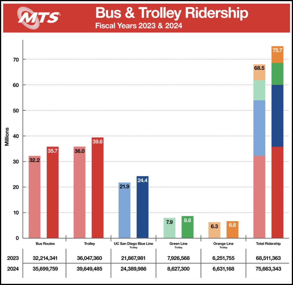 Other FY 2024 ridership milestones for San Diego MTS included: