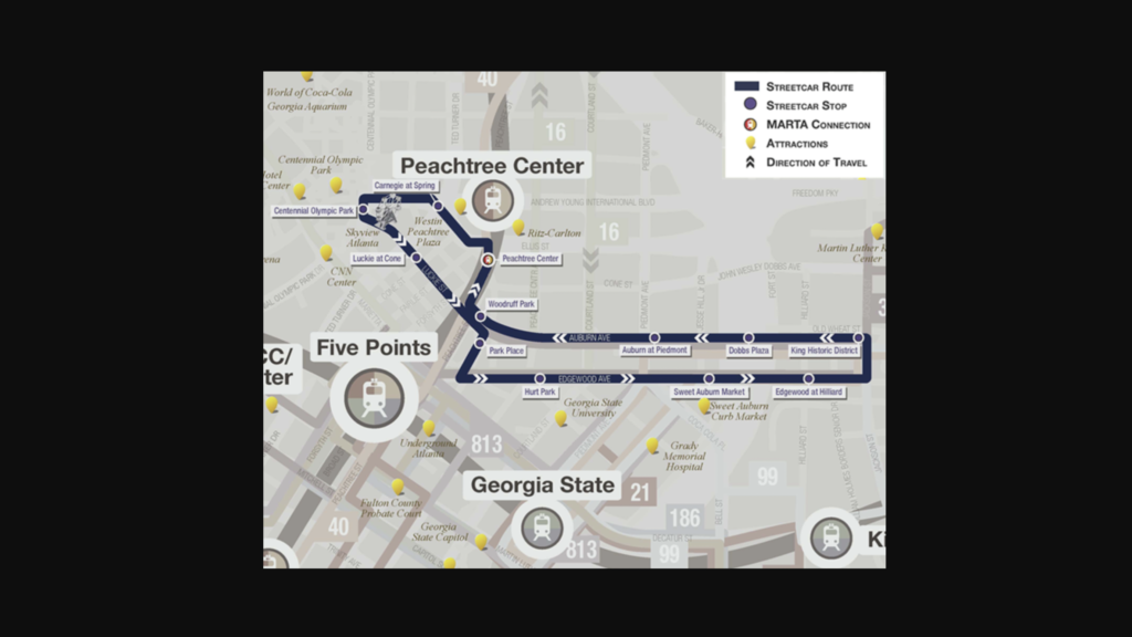 MARTA shuttle vans, wrapped to look like streetcars, will continue servicing the route as the streetcar vehicles return. The streetcar route connects the Martin Luther King Jr. National Historic Site to the east and the Centennial Olympic Park area to the west, with 10 other stops in between.