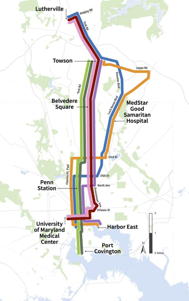- Bus Rapid Transit (BRT) from Lutherville to UMMC via Ridgely Road, York Road, Greenmount Avenue, Hillen Avenue/Gay Street and Baltimore/Fayette streets. (Line shown in maroon on map.)