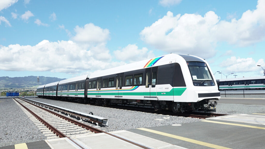 The initial operating segment of Honolulu’s 20-mile, 21-station autonomous (driverless) Skyline, the first urban rail transit GoA4 (Grade of Automation) system in operation in the United States, opened for revenue service in 2023. (Courtesy of HART)
