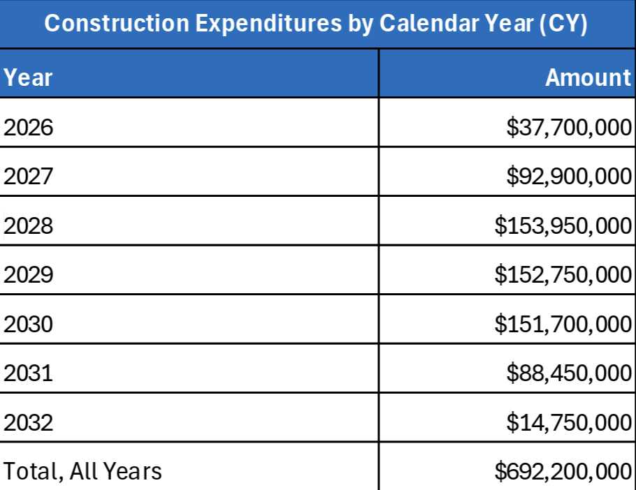 According to the Kleinhenz Economics report, the seven-year construction phase for the Claremont extension, which includes both final design and construction activities, “involves total costs of $798 million. Of that total, $692.2 million in spending on planning and design, real estate transactions costs, construction management, and direct construction costs will enter the Los Angeles County economy as direct expenditures over the time period between 2026 and 2032. The remaining $105.8 million includes railcar purchases of $32 million to be spent outside the area, and $73.8 million in real estate purchases. The former is treated as a leakage from the local economy while the latter is treated as an asset transfer, and as such, both are omitted from the construction portion of the economic impact analysis.” (Courtesy of Kleinhenz)