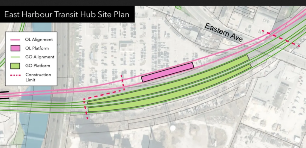 The East Harbour Transit Hub (see plan below) will serve the Lakeshore East and Stouffville GO Lines. To be located between Union Station and Danforth GO Station, the new station is expected to bring about 100,000 daily riders, according to Metrolinx.