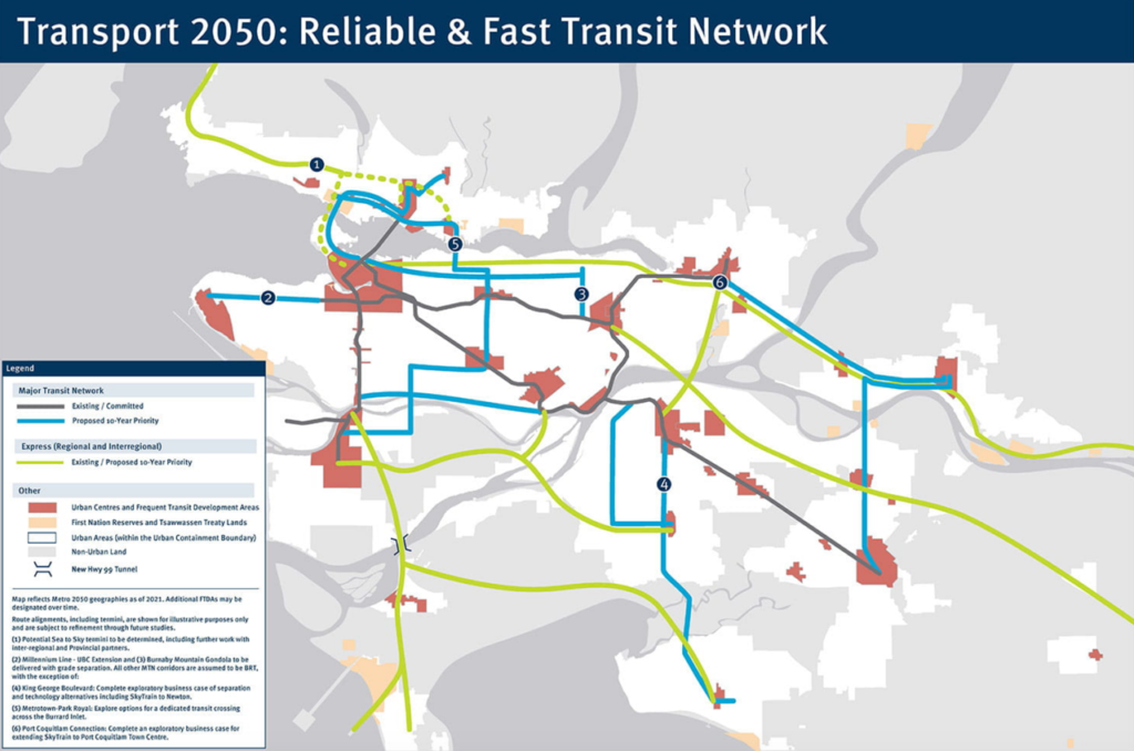 • Up to 106 miles (170 kilometers) of new rapid transit on up to 11 corridors, including up to nine Bus Rapid Transit (BRT) routes using new zero-emission buses on dedicated, traffic-separated lanes; a rapid transit connection to the North Shore; the Burnaby Mountain Gondola to SFU; and the Millennium Line SkyTrain extension from Arbutus Street to the University of British Columbia, “pending the development of a new funding model with project partners.”