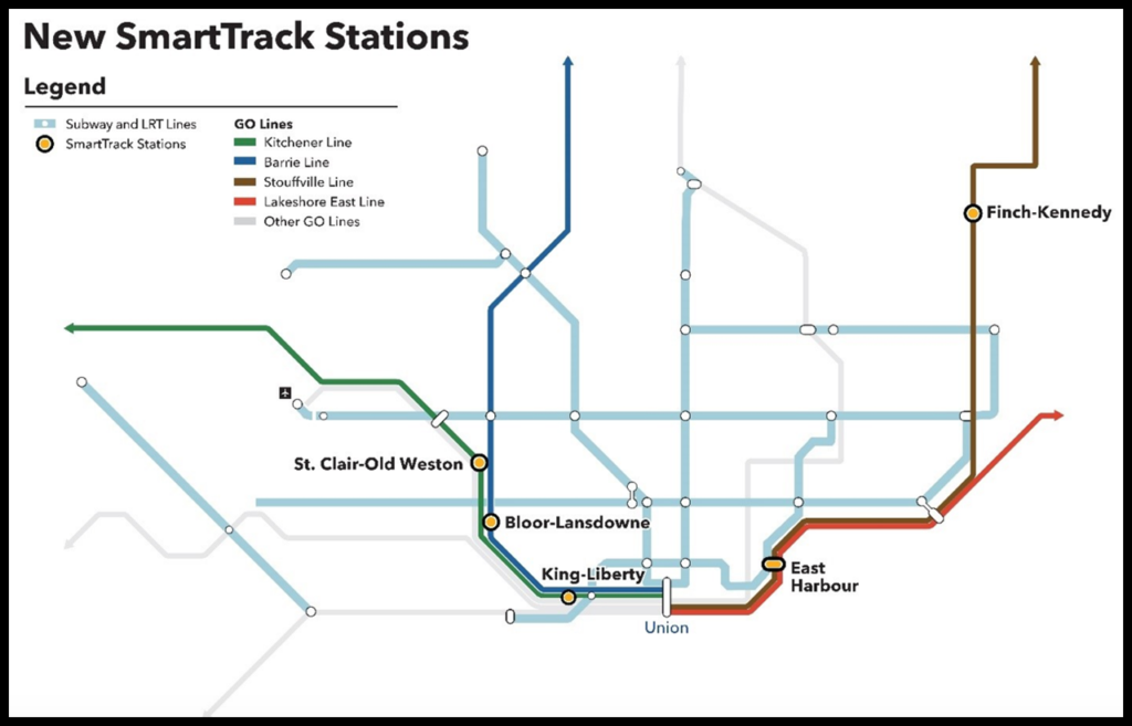 Metrolinx, the city of Toronto and the province of Ontario have released a Request for Proposals (RFP) for construction of the East Harbour Transit Hub, the first of five new SmartTrack GO regional/commuter rail stations across the city. The SmartTrack Stations program will build new rail stations along roughly 25 miles (40 kilometers) of Metrolinx’s existing GO rail corridors to “provide a greater choice of reliable and convenient route options to shorten commutes and increase quality of life for people traveling in the city,” according to Metrolinx.